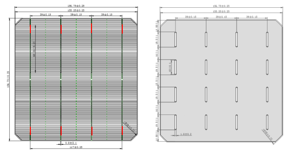 4 busbars (silver), width 0.8mm, 96 finger grids blue anti-reflecting coating (silicon nitride), 15% hollow part |
