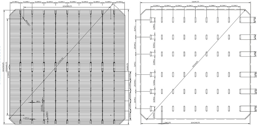 9 busbars(silver), width 0.1±0.03mm, 124 finger grids Blue anti-reflecting coating(silicon nitride) |