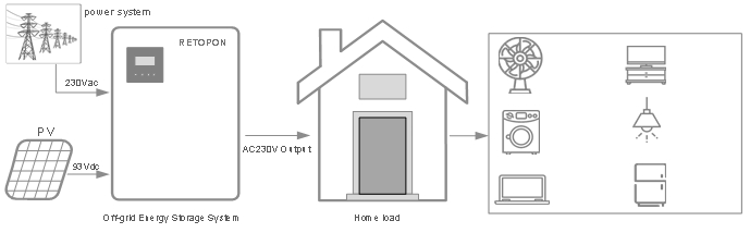 This off-grid household energy storage system supports both photovoltaic direct current and grid alternative current charging modes, and allows up to 3KW AC power output in 110V,220VAC / 50Hz/60Hz pure sine wave for low-voltage electrical appliances, such as televisions, electric fans, refrigerators, air conditioners, washing machines, microwave ovens, and so on. This product integrates a lithium battery management system inside the cabinet to ensure longer lifetime, outside which its intelligent control interface is user friendly and convenient for operation. The product is an ideal household green energy storage device for occasions where electricity is not available or unpredictable.