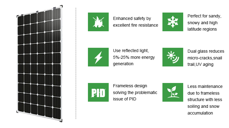 Bifacial Solar Panel The power generation gain of the Bifacial Solar Panel mainly comes from the back side, and by receiving the reflected light from the atmosphere and the reflected light on the ground, the overall power generation of the bifacial module is increased. When the sun shines on the Bifacial Solar Panel, some of the light is reflected by the surrounding environment to the back of the panel. This part of the power can be absorbed by the battery, improving panels efficiency.
