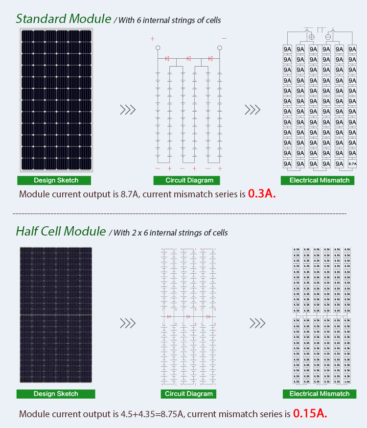 Instead of 6 internal strings of cells, half cell module has 2*6 shorter ones. This design effectively deals with the mismatch happened between cells caused by shadow, out of sync performance degradation, etc.